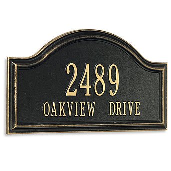 Add inviting curb appeal to your home with a stunning address sign. This individually sandcast house number plaque is personalized with permanently raised lettering that's easily seen from the street, not only important for your guests, but for delivery men and emergency personnel. Color accents are baked on rust-free aluminum for durability, so you can enjoy your address plaque for many years. Available as a decorative wall plaque or lawn address plaque with stake. The Hawthorne address sign includes brass screws; lawn plaque also includes two 18" stakes. Made in the USA.Hawthorne metal address plaque is available in 12 color combinations (for photos, click on "View Larger/Additional Views" on the left): Black with gold lettering All antique brass lettering Black with white lettering Dark blue with gold lettering Green with gold lettering Bronze with gold lettering Pewter with silver lettering Red with gold lettering White with gold lettering White with black lettering All antique copper lettering Blue with silver lettering Please allow up to 4 weeks for delivery.Personalized items are not returnable.Please specify color code, numbers and letters, as appropriate. Hawthorne Address Plaque.. Oval shape. Three lines. Wall Address Plaque, 14 letters/spaces on the first line, 5 numbers on the second line and 14 letters/spaces on the third line, 10-1⁄ 4" x 14-1⁄4" wide. Lawn Address Plaque, 15 letters/spaces on the first line, 5 numbers on the second line and 15 letters/spaces on the third line, 14" x 19" wide.