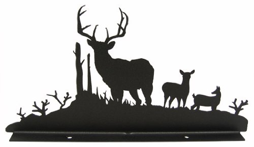 Description: A silhouette of a buck and two deer stand on top of this mailbox topper. Laser cut with great quality and detail. Size: 12"W x 6-1/4"T x 1"D. Material:14 gauge steel. Finish: .Black wrinkle powder coat.